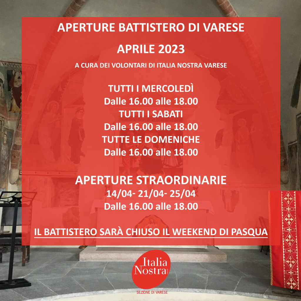 In evidenza Le nostre iniziative Notizie Aperture battistero di Varese – Aprile 2023 Aprile 7, 2023 admin aperture, cultura, ItaliaNostra, ItaliaNostraVarese, varese, vareselandoftourism, visite, visiteculturali Durante il mese di aprile 2023 il battistero di Varese sarà aperto, a cura dei volontari di Italia Nostra Varese, nei seguenti giorni ed orari: