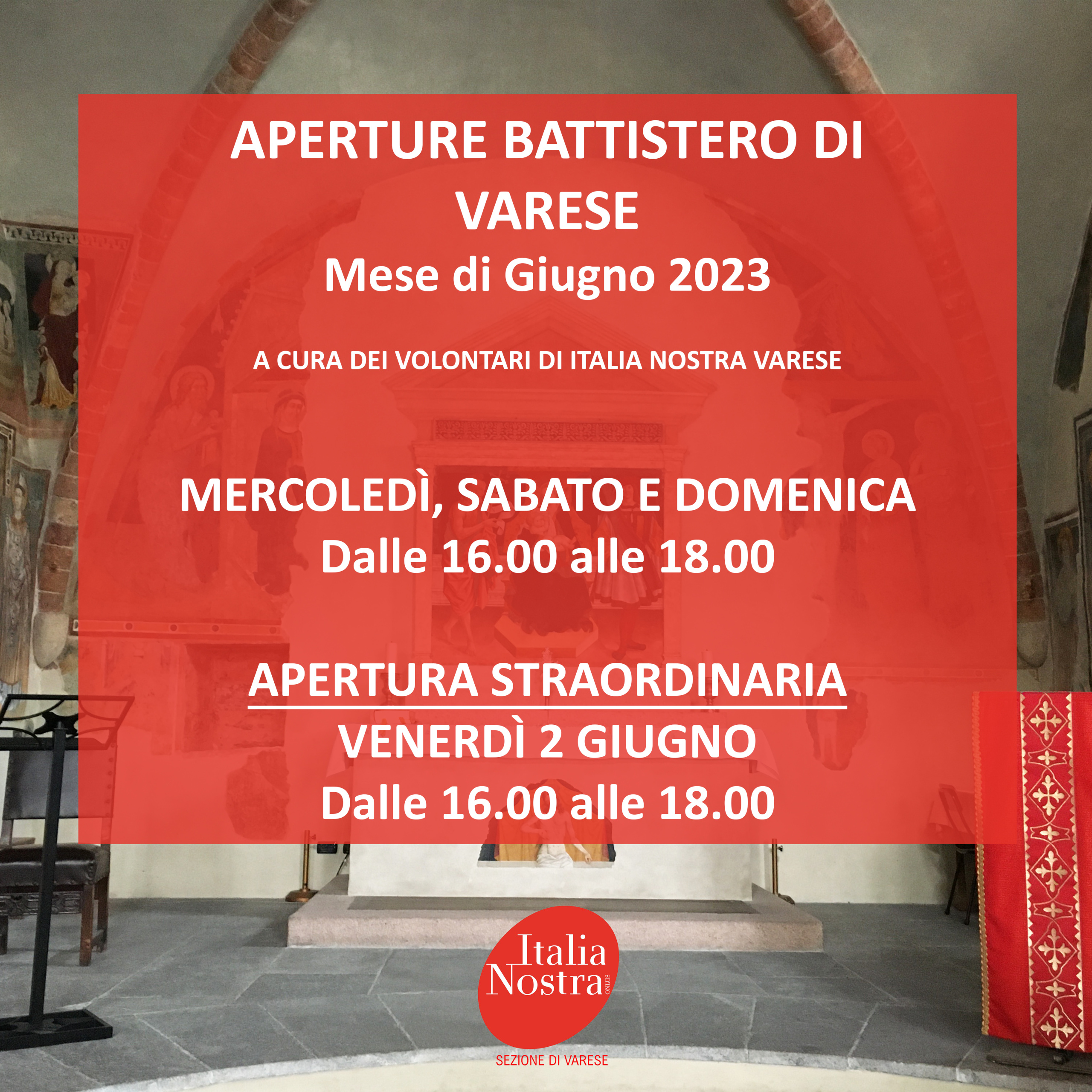 ➡Il Battistero di Varese sarà aperto nel mese di Giugno 2023, a cura dei volontari di Italia Nostra Varese, tutti i mercoledì, sabato e domenica dalle 16.00 alle 18.00