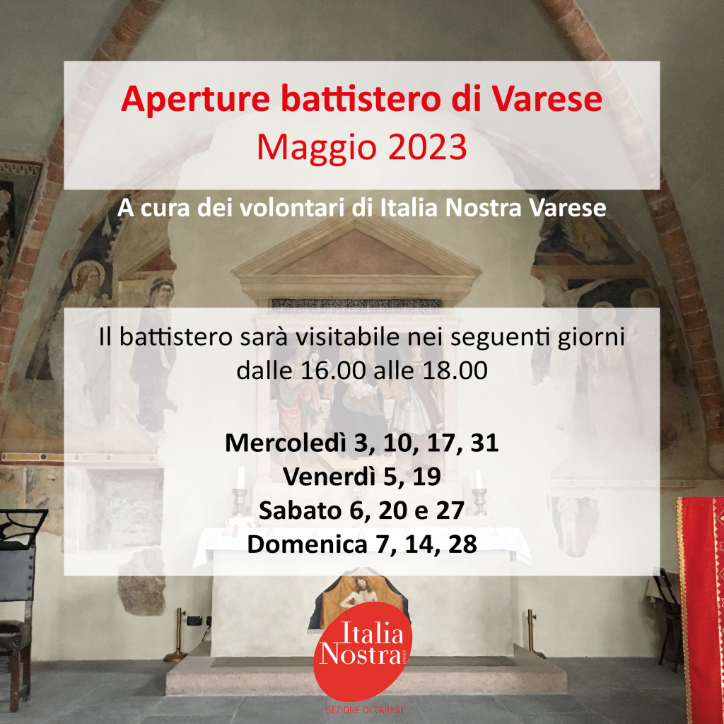 In evidenza Le nostre iniziative Notizie Aperture battistero di Varese – Maggio 2023 Maggio 3, 2023 admin battistero, ItaliaNostra, ItaliaNostraVarese, varese, volontari Il Battistero di Varese sarà aperto nel mese di Maggio 2023, a cura dei volontari di Italia Nostra Varese, nei seguenti giorni dalle 16.00 alle 18.00: Mercoledì 3, 10, 17, 31 Maggio Venerdì 5 e 19 Maggio Sabato 6, 20 e 27 Maggio Domenica 7, 14 e 28 Maggio #battistero #battisterodivarese #varese #turismo #italianostra #italianostravarese