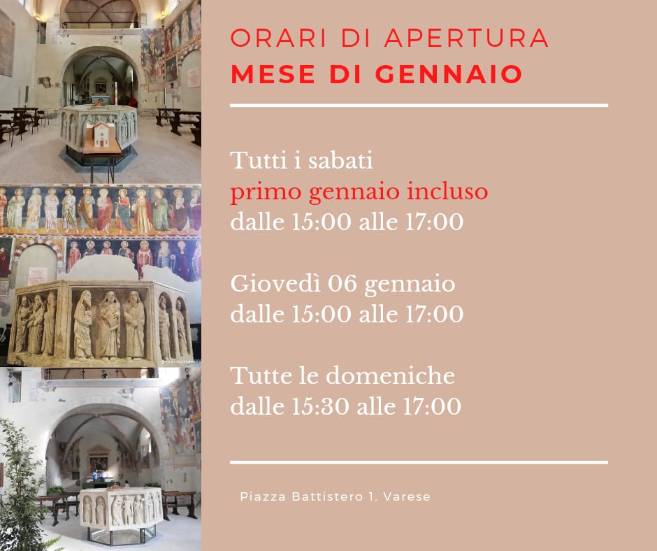 Nel mese di gennaio il Battistero di Varese sarà aperto visitabile 𝘁𝘂𝘁𝘁𝗶 𝗶 𝘀𝗮𝗯𝗮𝘁𝗶, compreso il 𝗽𝗿𝗶𝗺𝗼 𝗴𝗲𝗻𝗻𝗮𝗶𝗼 dalle ore 15:00 alle 17:00 e 𝘁𝘂𝘁𝘁𝗲 𝗹𝗲 𝗱𝗼𝗺𝗲𝗻𝗶𝗰𝗵𝗲 dalle ore 15:30 alle 17:00.