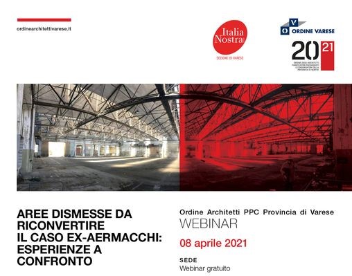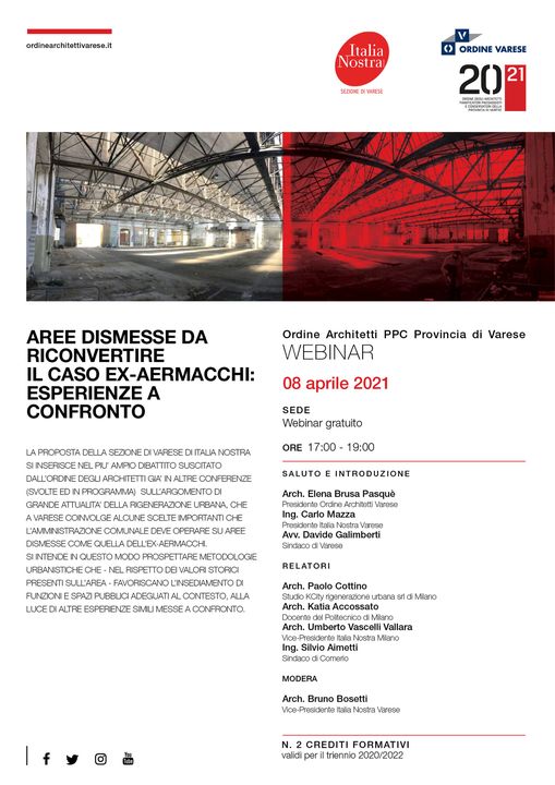 Giovedì 8 aprile alle ore 17.00 Italia Nostra Varese insieme con l’Ordine degli architetti di Varese propone un webinar sull’attuale tema della rigenerazione urbana, che a Varese coinvolge grandi aree come quella della ex-Aermacchi.