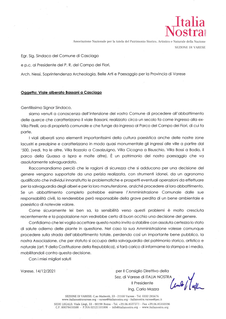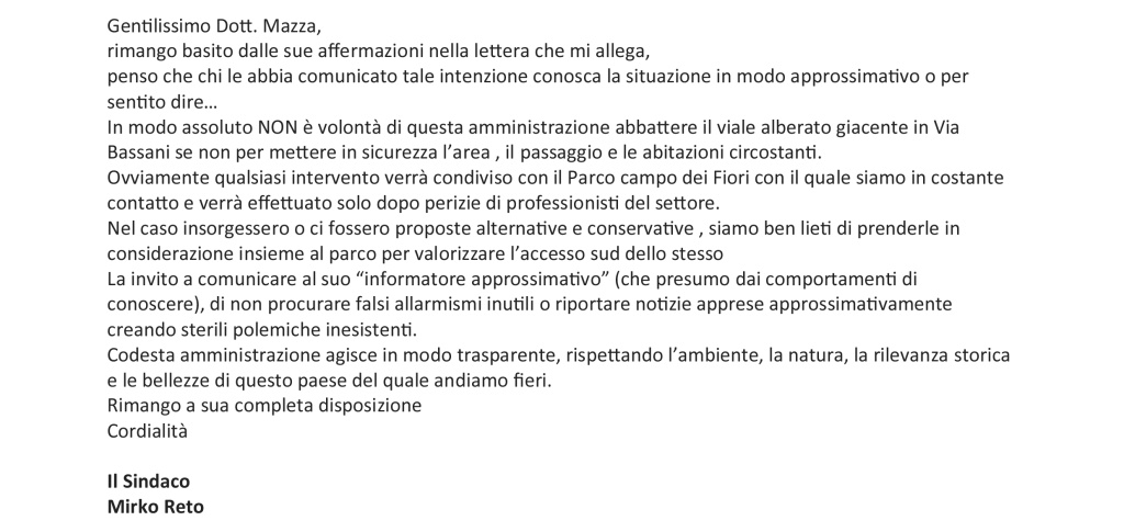 Di seguito la lettera scritta da Italia Nostra Varese al sindaco di Casciago, con la risposta del sindaco che rassicurava sulla falsità delle voci di abbattimento.