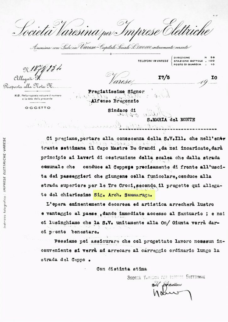 Da un’accurata indagine storica svolta all’archivio comunale, svolta nel 2000 in occasione del progetto degli interventi per la valorizzazione di S. Maria del Monte, si era rinvenuto un documento datato 17/5/1910 che attribuisce, senza ombra di dubbio, all’Arch. Sommaruga la paternità del progetto “della scalea che dalla strada comunale del Ceppo ….conduce alla strada superiore per le Tre Croci”, ed all’Impresa De Grandi la sua esecuzione (vedi documento allegato). Si tratta della comunicazione di inizio dei lavori che la Società Varesina per Imprese Elettriche, che aveva anche realizzato la Funicolare, fa al Sig. Alfonso Bregonzio all’epoca Sindaco del comune di Santa Maria del Monte, poi accorpato a quello di Varese.