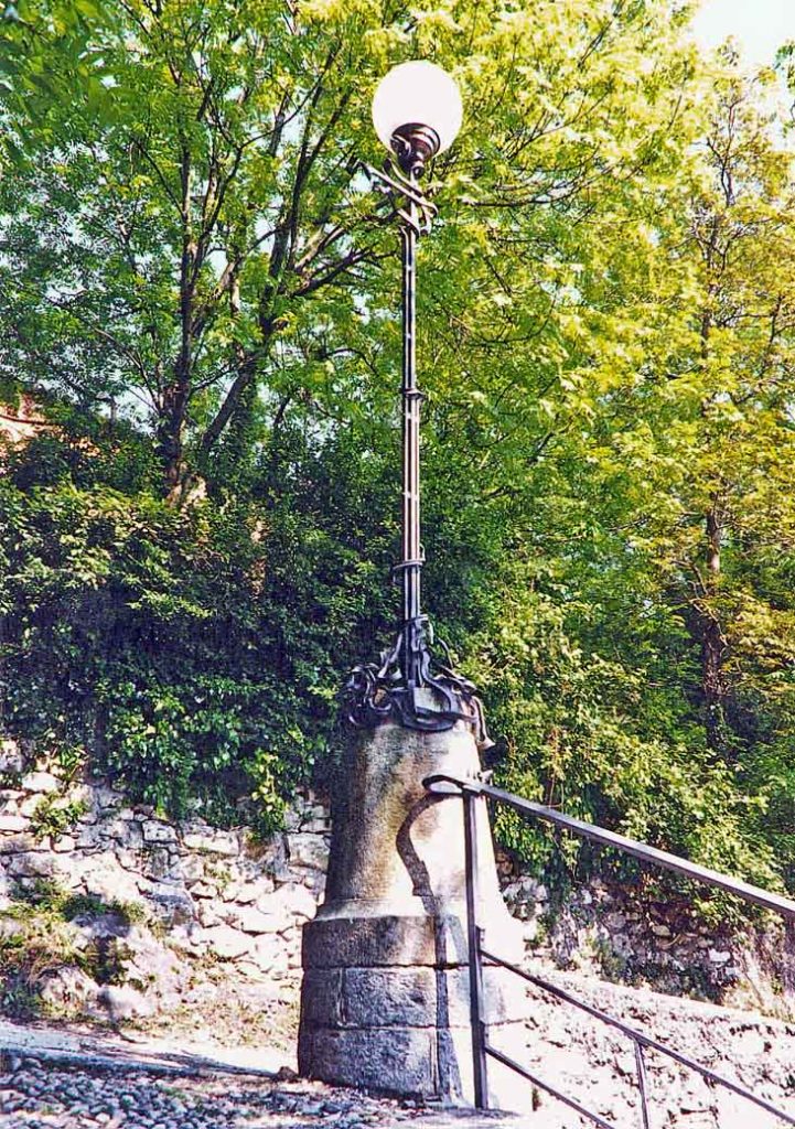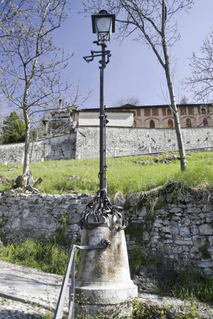 I corpi illuminanti posti sulla sommità dei pali costituiti da lanterne di serie, risultano posticci e sicuramente non congruenti con le tipologie originali. Infatti si può dimostrare con foto riprese nel 1999 che ancora esisteva un palo con una una sfera di vetro opalino (vedi foto allegata).