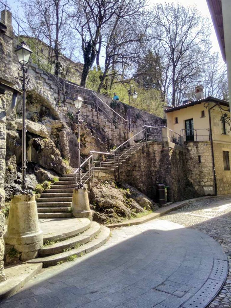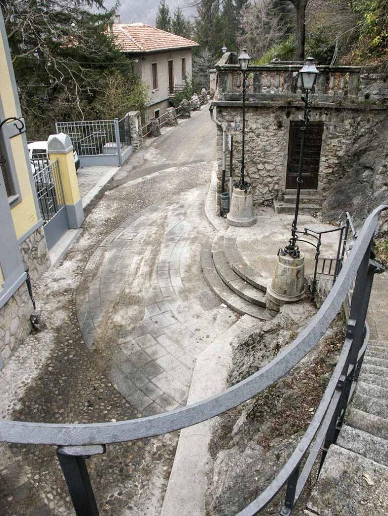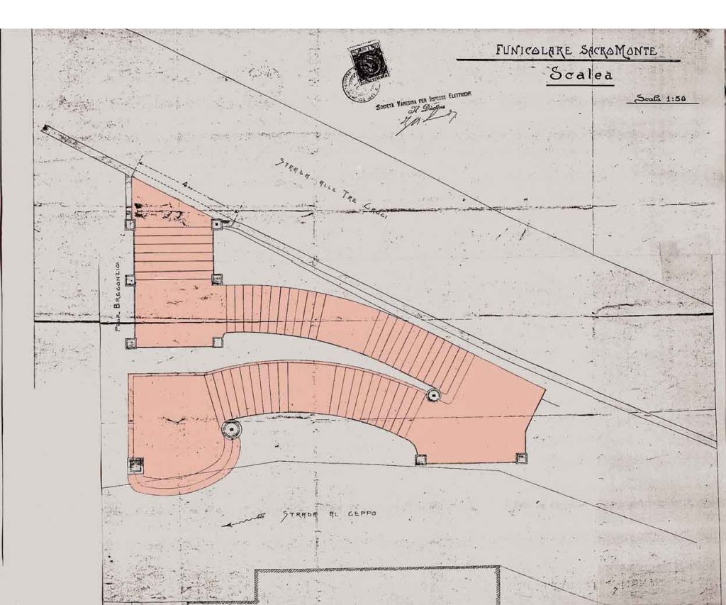 Esiste pure la domanda che la stessa società rivolge al Sindaco per tale opera, corredata da un disegno in scala 1 : 50 che però non riporta la firma del Sommaruga, in tale domanda si finalizza l’opera “per migliorare e facilitare l’accesso dalla Stazione di arrivo della funicolare all’abitato di S. Maria del Monte e specialmente allo storico Santuario; si precisa che sarà necessario demolire un tratto di circa quattro metri del “muro formante parapetto della strada verso valle”. La Commissione Edilizia concede il nulla osta, che poi il Sindaco rettifica raccomandandosi che i primi gradini della scalea non invadano in alcun modo la sede stradale. Tale sede stradale si è scoperto che era già stata oggetto di rettifica al momento della costruzione della stazione di arrivo della Funicolare, infatti la stessa società in data 5/11/1907 chiede di poter arretrare la sede stradale di circa tre metri per poter realizzare l’edificio, costituendo così un’ansa sulla via del Ceppo che in origine risultava rettilinea.