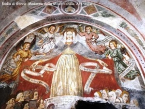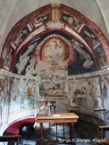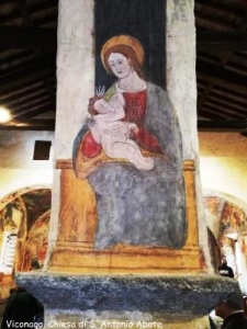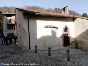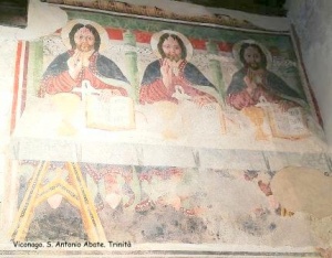 Lasciata la Badia, gli affreschi della sua Chiesa, risalenti ai secoli XIII/XV, il silenzio e la pace del chiostro, raggiungiamo il borgo di Viconago, che dall’alto di una collina domina la valle sottostante e il lago di Lugano. Nel centro storico, tra gli stretti vicoli, custodita come in uno scrigno, troviamo la chiesetta di S. Antonio Abate, anch’essa ricca di affreschi databili tra l’ XI e il XVI secolo, tra i quali spicca soprattutto una rarissima Trinità, raffigurata con tre immagini quasi identiche di Cristo.